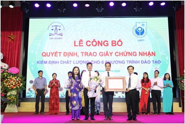 PGS.TS Mai Văn Trinh – Cục trưởng Cục Quản lý chất lượng, Bộ Giáo dục và Đào tạo cùng PGS.TS Nguyễn Phương Nga – Giám đốc Trung tâm Kiểm định chất lượng giáo dục – Hiệp Hội các trường đại học, cao đẳng Việt Nam đã trao Giấy chứng nhận và tặng hoa chúc mừng Nhà trường. Bên cạnh đó, có các đại diện các đơn vị, doanh nghiệp trong và ngoài trường cũng đã tặng hoa chúc mừng Nhà trường.