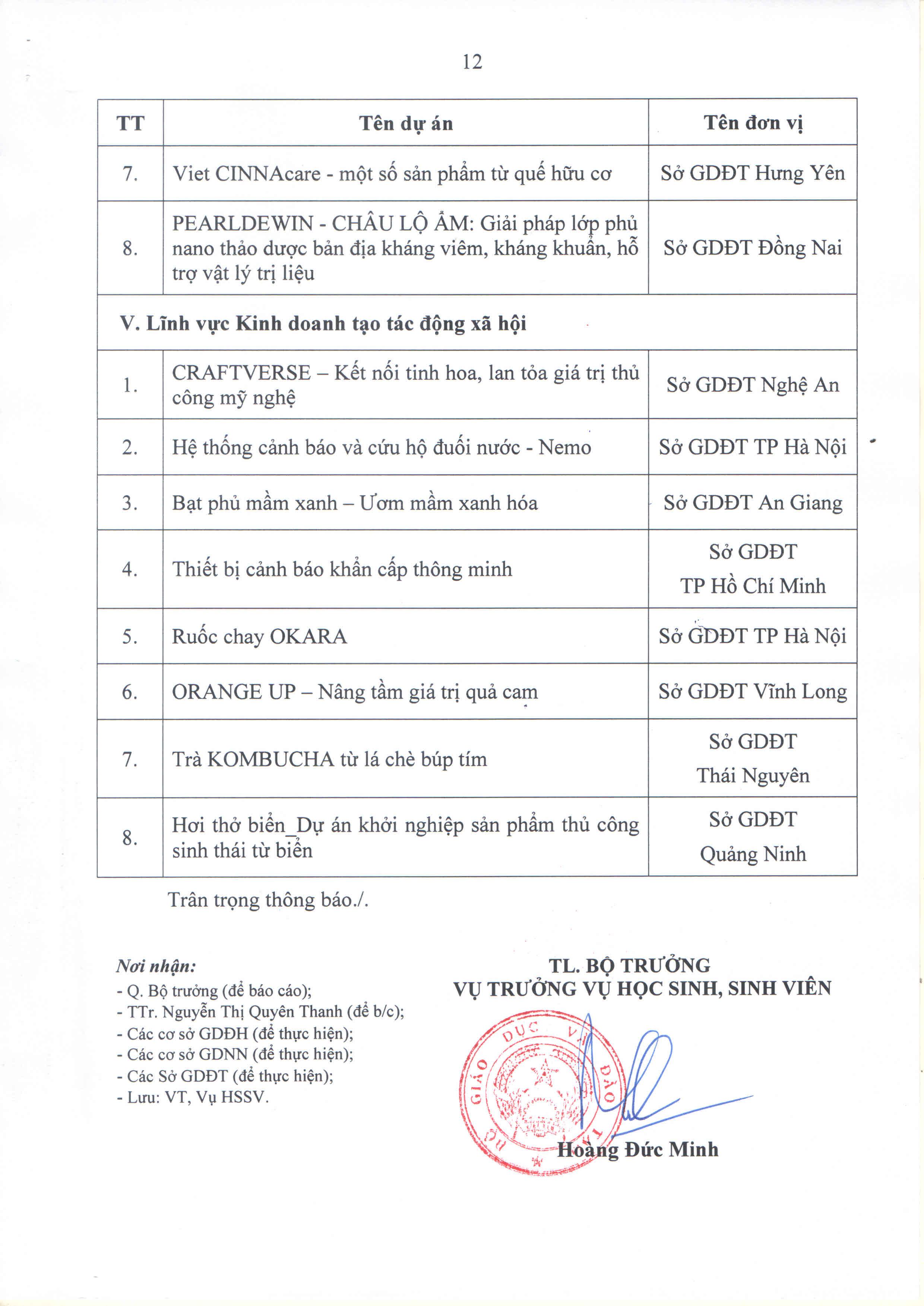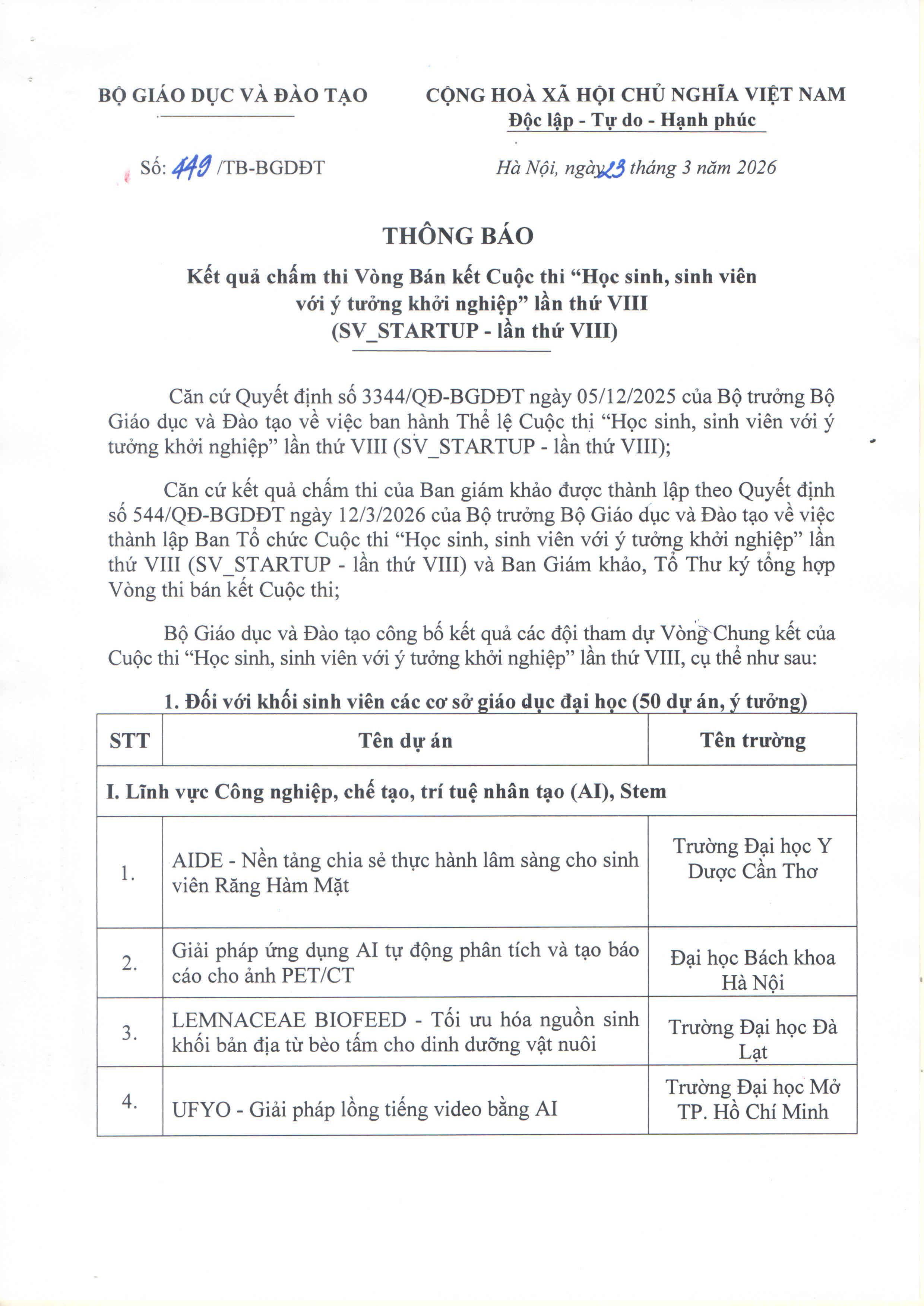 Ngày 23/3/2026, Bộ Giáo dục và Đào tạo ban hành văn bản số 449/TB-BGDĐT thông báo Kết quả chấm thi Vòng Bán kết Cuộc thi “Học sinh, sinh viên với ý tưởng khởi nghiệp” lần thứ VIII (SV_STARTUP - Lần thứ VIII)