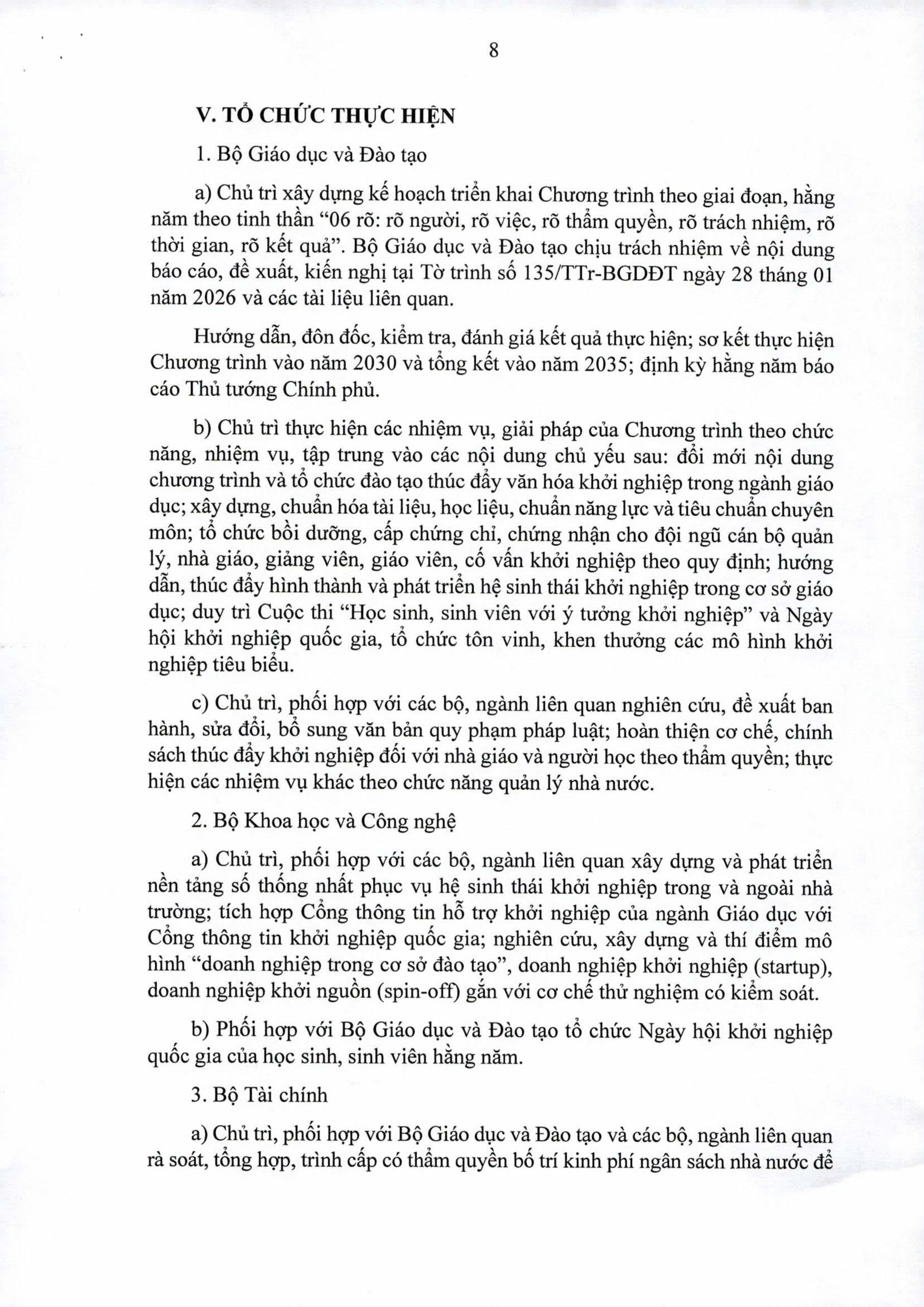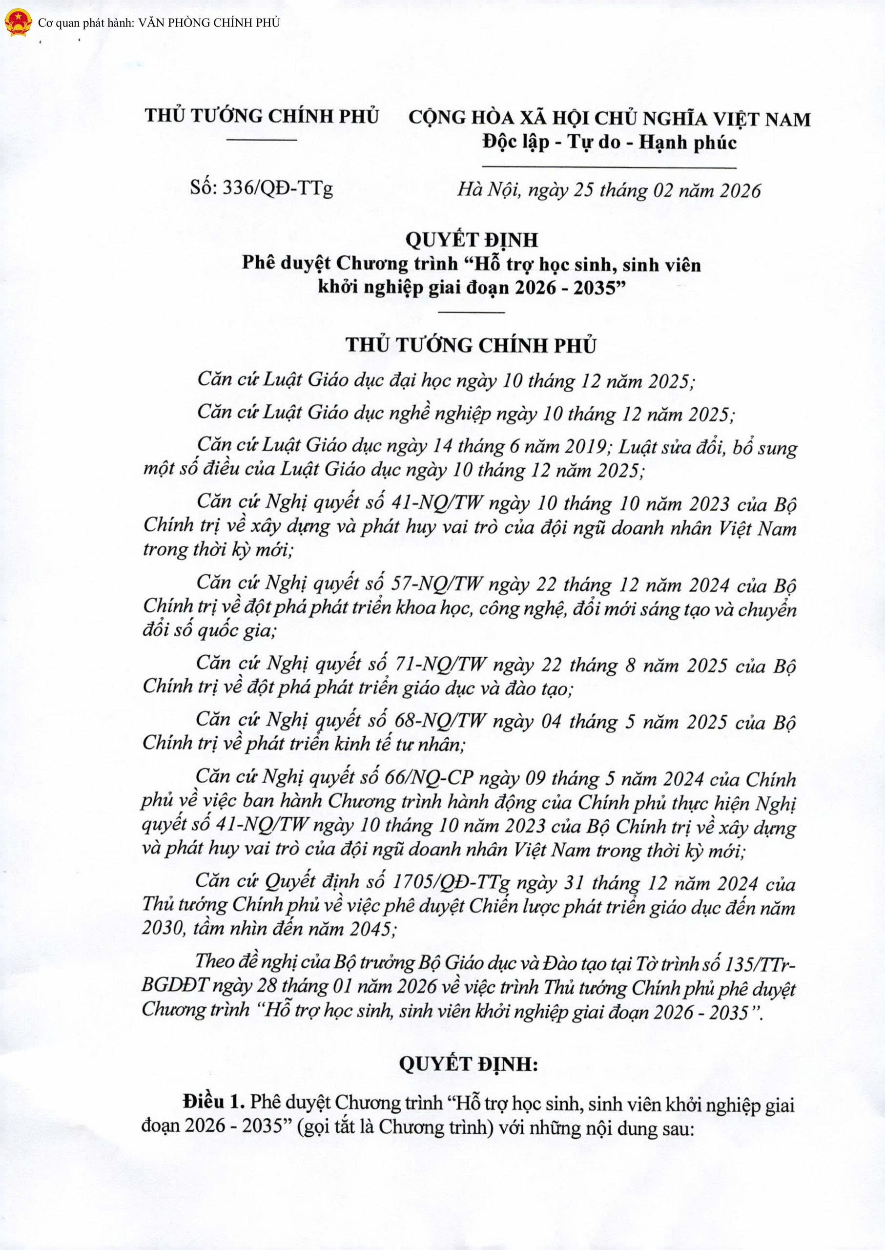 Thủ tướng Chính phủ đã ban hành Quyết định phê duyệt Chương trình “Hỗ trợ học sinh, sinh viên khởi nghiệp giai đoạn 2026 – 2035”.